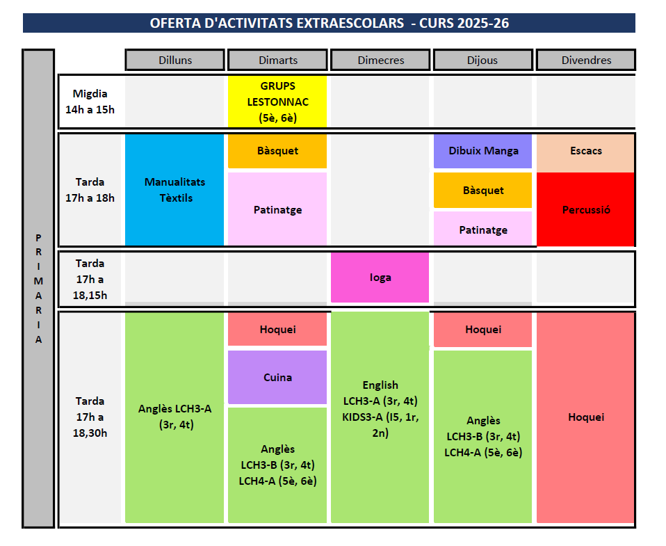 - Horari: Totes les classes de 17 a 18,30h. Dilluns i dimecres (3r i 4t grup LCH3-A), Dimarts i dijous (3r i 4t Grup LCH3-B) (5è i 6è LCH4-A), Dimecres (i5, 1r i 2n EP)