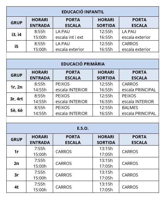 E.S.O. : Començaran dilluns 8 de setembre en horari de matí i tarda. De dilluns a divendres, matins de 8h a 13,15h i tardes de 15h a 17h. Divendres tarda no hi ha classe.